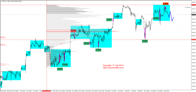 Индекс формирует зону накопления объемов 1960-1975. Крупные объемы прошли вчера на максимумах. Теперь цена может вернуться к нижней границе и обновить 1958.
